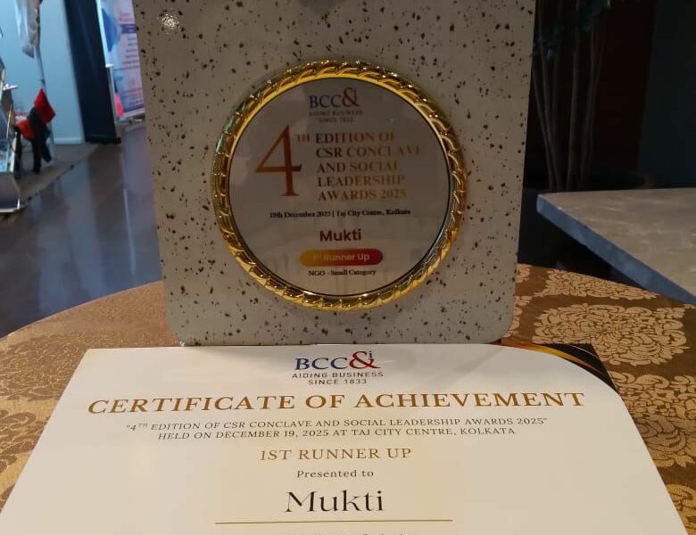 Mukti has been honoured with the First Runner-Up Award by the Bengal Chamber of Commerce and Industry (BCCI) for its Mukti Support School (MSS) initiative under the NGO – Small Category. The recognition was presented at the 4th Edition of the CSR Conclave & Social Leadership Awards 2025, held on 19 December 2025 at Taj City Centre, Kolkata.