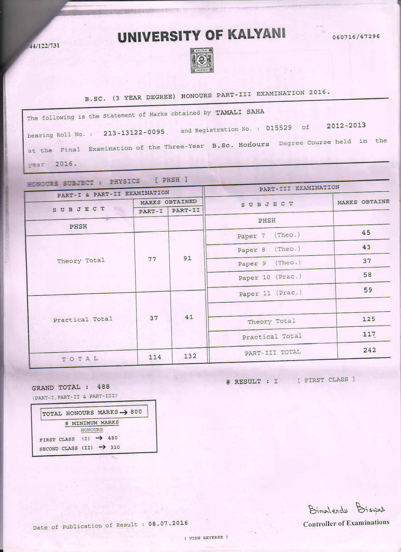 B.Sc. Part 3 Marksheet