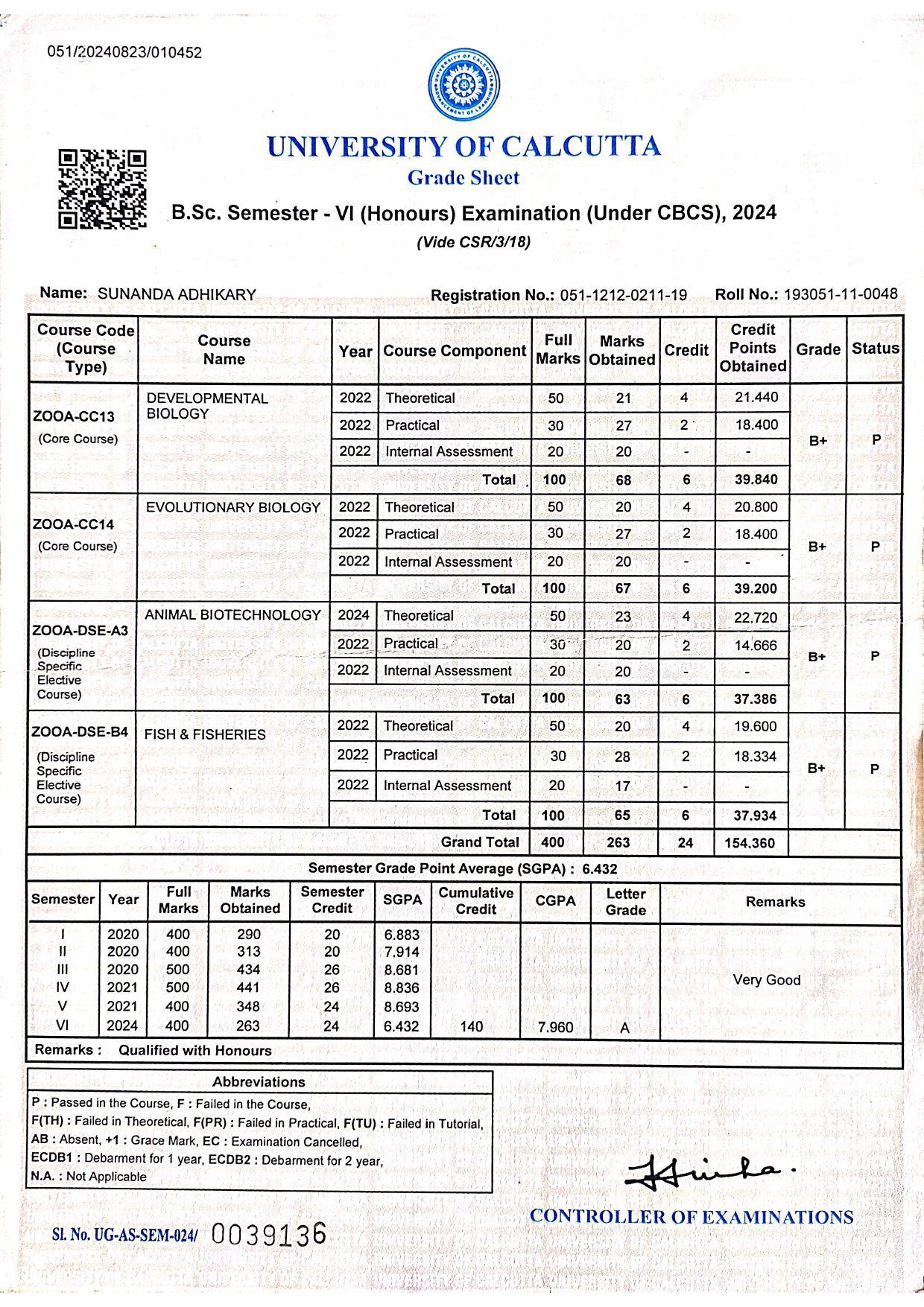 B.Sc in Zoology Hons 6th Semester Marksheet