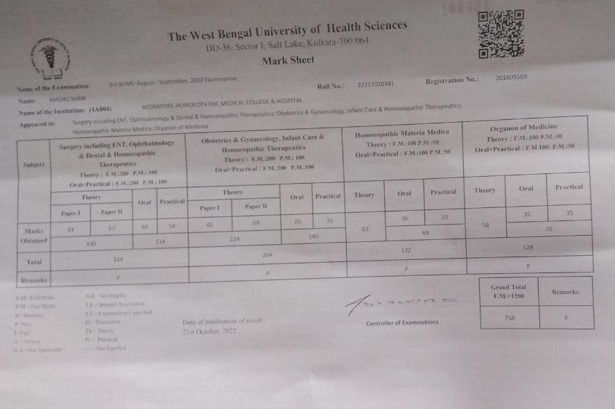 BHMS (Homeopathic Medicine & Surgery) 3rd year Mark Sheet