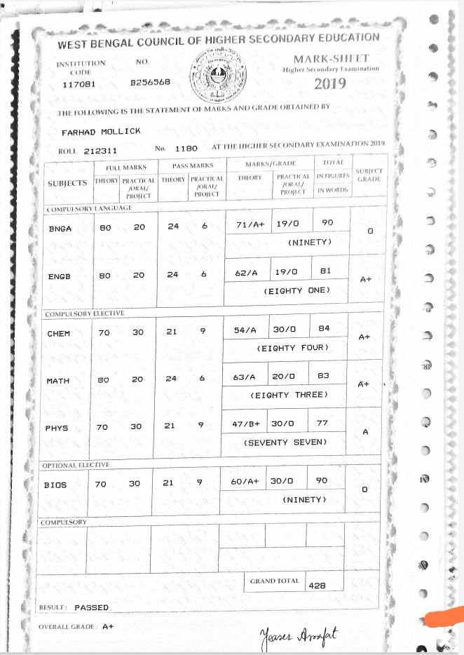 Madhyamik/10th standard marksheet