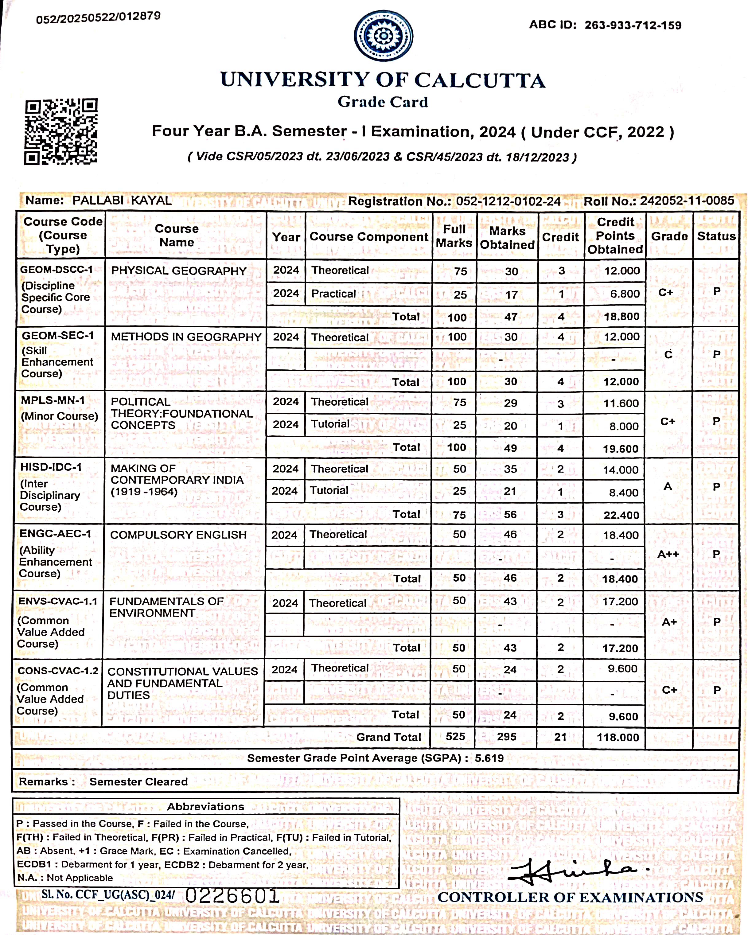 B.A in Geography Honours, 1st Year 1st Semester Marksheet