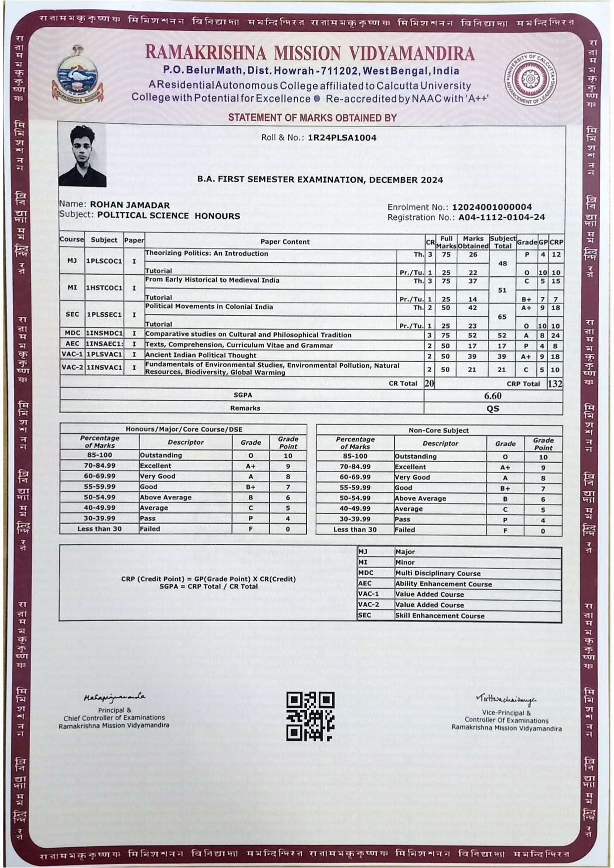 B.A.in Political Science Hons. 1st Semester Marksheet