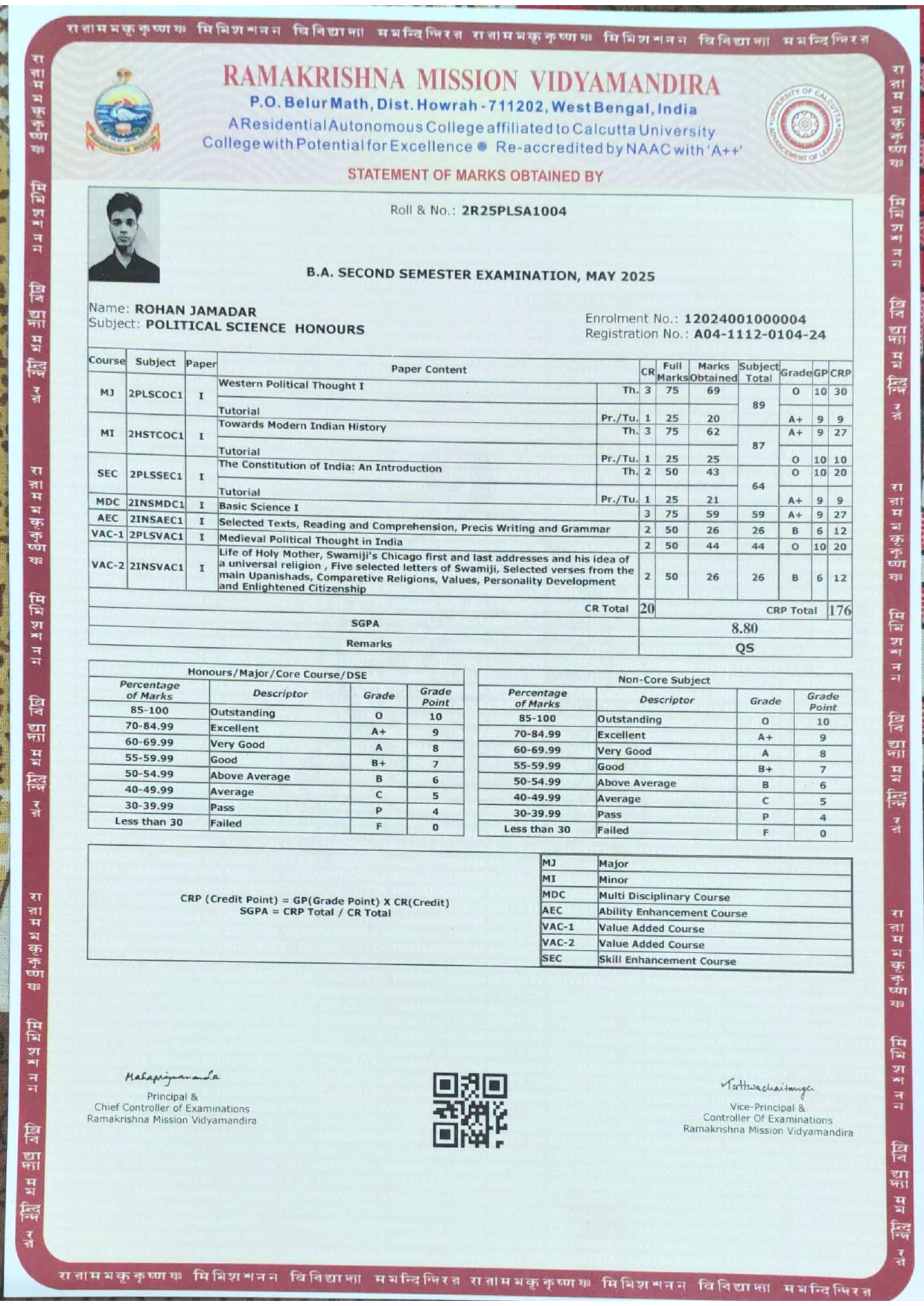 B.A in Political Science Hons, 2nd Semester Marksheet