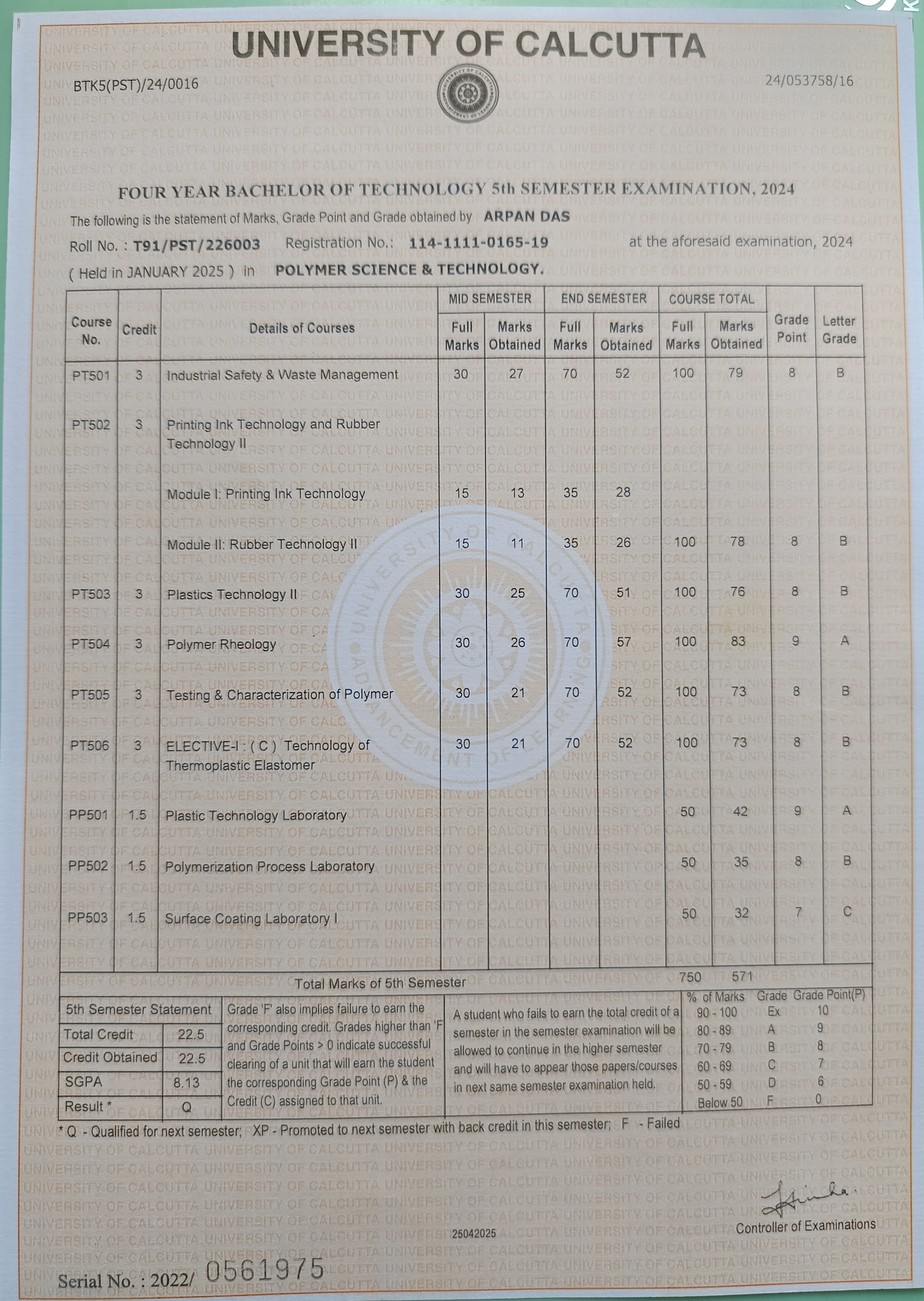 B.Tech Polymer science & Technology 5th Semester Marksheet