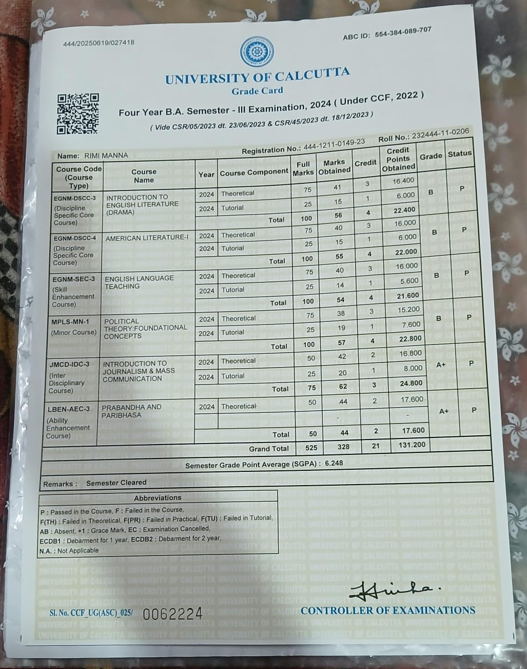 B.A English Honours 1st Year 2nd Semester Marksheet