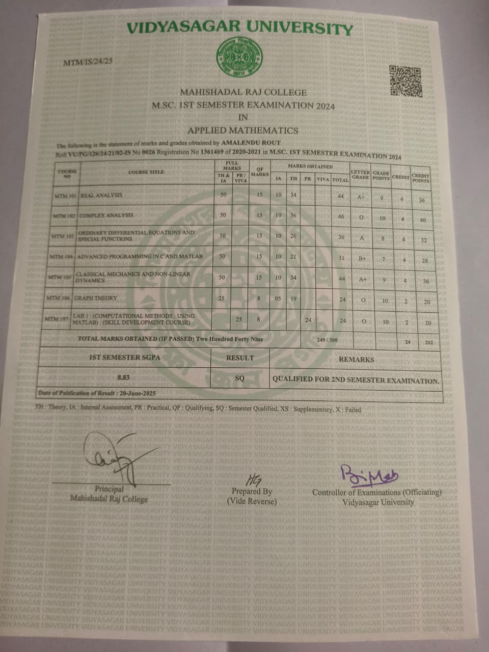M.Sc in Mathematics Hons 1st Semester Marksheet